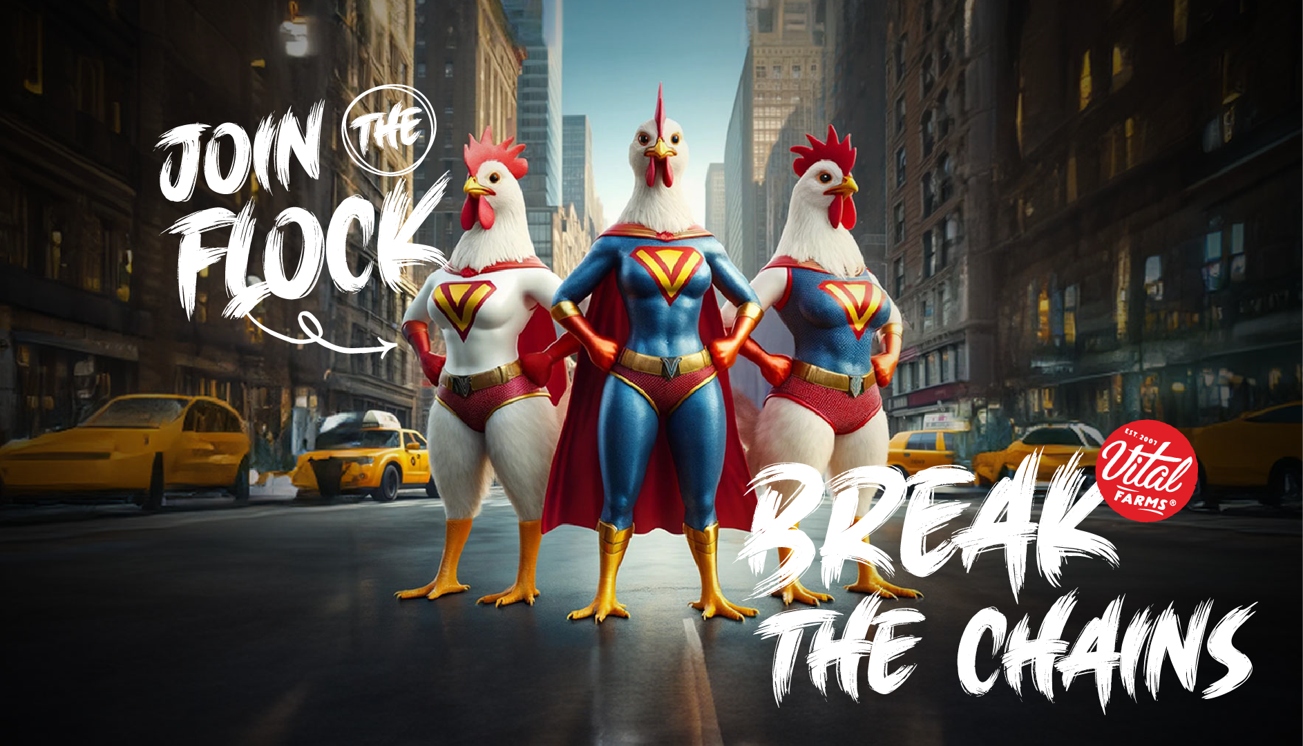 A captivating video showcasing Vital Farms' organic eggs, incorporating the iconic Queen song "I Want to Break Free" to add emotional resonance and energy. The video will feature Vital Farm’s free-range hens portrayed as superheroes, symbolizing the brand's commitment to ethical farming practices and the freedom of choice. Alongside the heroic imagery, the video will highlight the superior taste, freshness, and nutritional benefits of Vital Farms' organic eggs, inspiring viewers to try them for the first time.